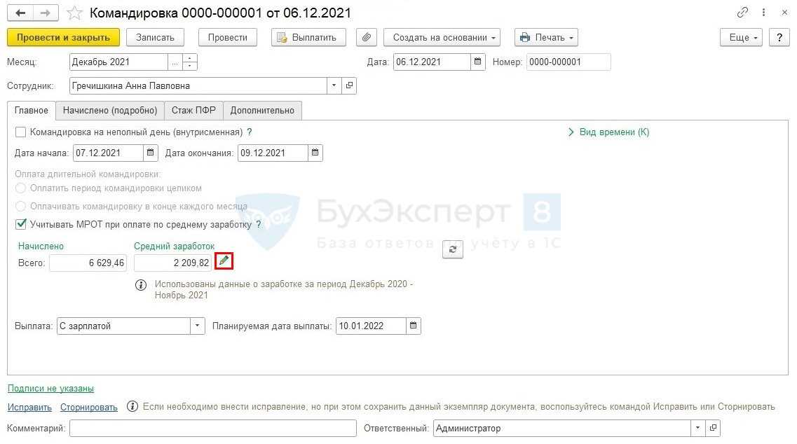 Если в документе Командировка установлен флажок Учитывать МРОТ при оплате по среднему заработку, при расчете оплаты программа сравнит средний заработок сотрудника с МРОТ и использует в расчете наибольшее значение.