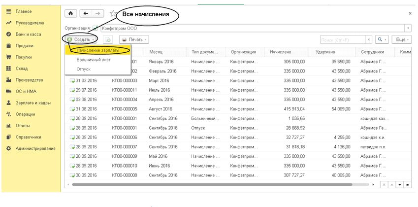 Можно заметить, что присутствуют две кнопки с функцией создания. Если требуется начислить оплату одному сотруднику, то используется кнопка «Создать» в левой верхней части формы.