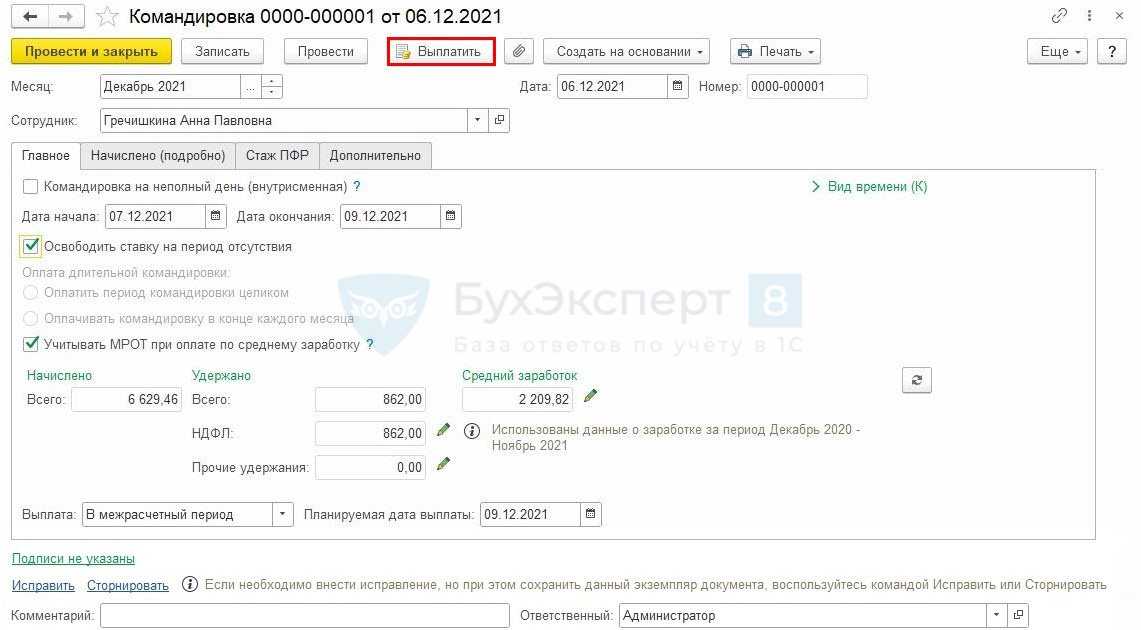 Если выплата командировочных выполняется отдельно от зарплаты или авансом, то в верхней части формы активна кнопка «Выплатить». В этом случае удержания рассчитываются от суммы выплаты: