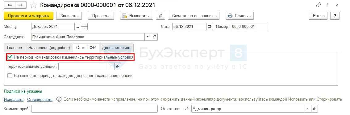 Если командировка предполагает работу в особых территориальных условиях, то необходимо проверить актуальность данных об этом на закладке «Стаж ПФР»: