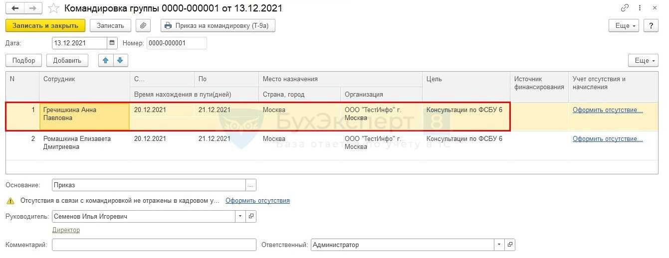 - Указать сотрудника, отправляющегося в командировку, и ответственного лица.