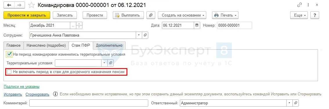 Если командировка прерывает льготный стаж работника, потребуется включить флажок Не включать период в стаж для досрочного назначения пенсии.
