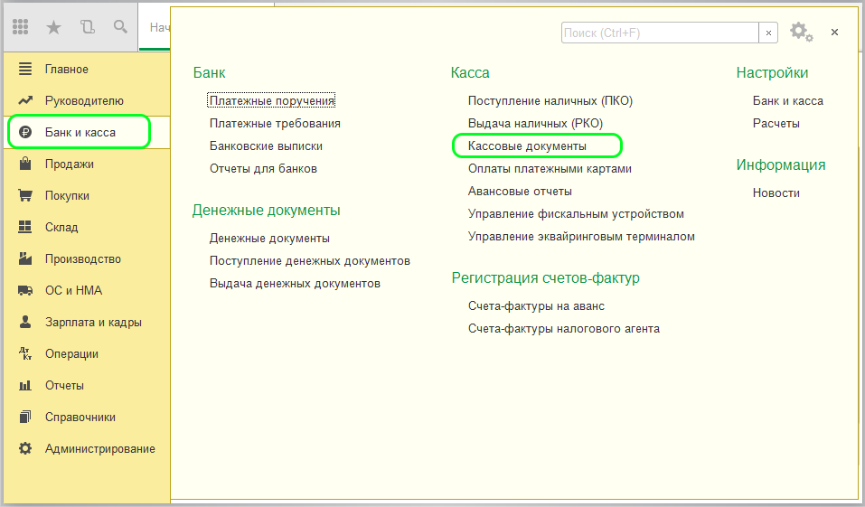 Приступим к оформлению расчетного кассового ордера. Выбираем раздел «Банк и касса», далее «Касса» и «Кассовые документы».