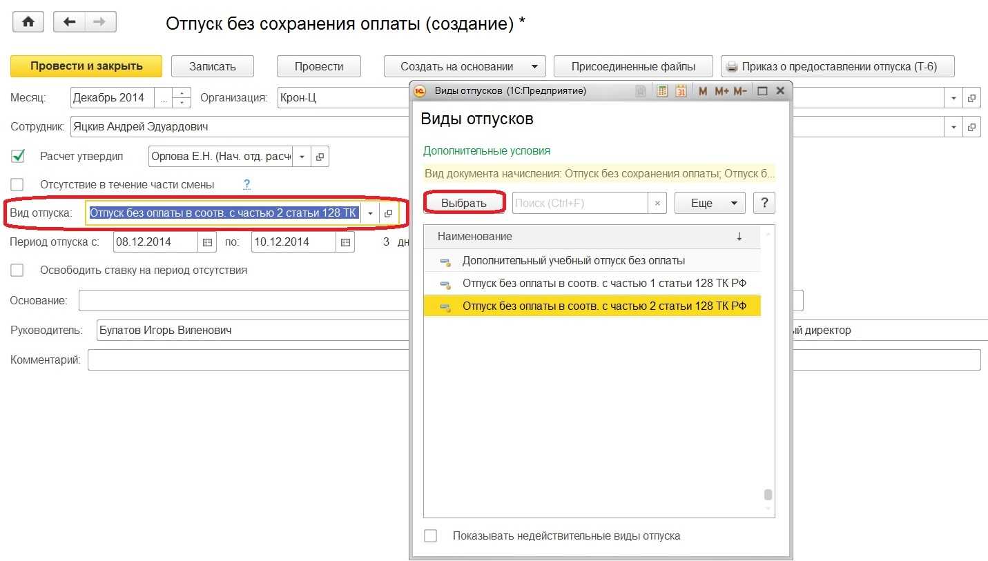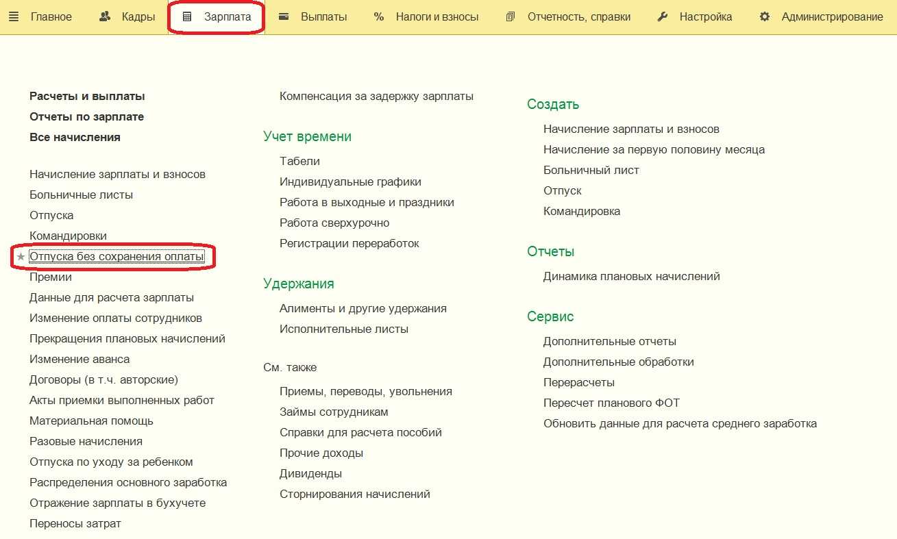 Отпуск без сохранения зарплаты в 1С:Бухгалтерия