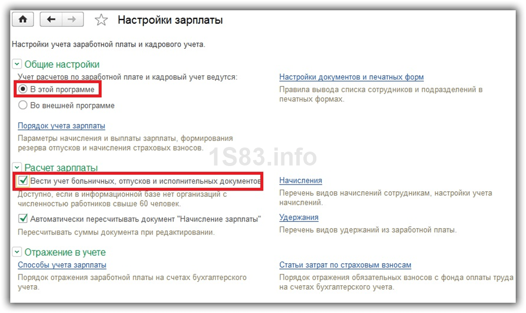 Перед вами отобразится окно настроек, в котором обязательно необходимо указать, что кадровый учет и учет по зарплате будут вестись в этой программе. Далее, в разделе «Расчет зарплаты» установите флаг на пункте «Вести учет больничных, отпусков и исполнительных документов». Без этой надстройки вы попросту не сможете создать соответствующие документы.