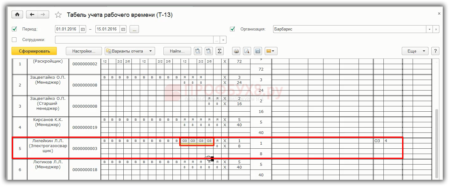 Выбираем раздел Зарплата – Отчеты по зарплате – Учет времени – отчет Табель учета рабочего времени Т-13. Указываем период – первая половина месяца и организацию. В 1С ЗУП 3.0 формируется табель рабочего времени сотрудников, согласно их графику работы с учетом отклонений, в том числе с учетом отпуска без сохранения зарплаты. Данный период отразился обозначением «ОЗ»: