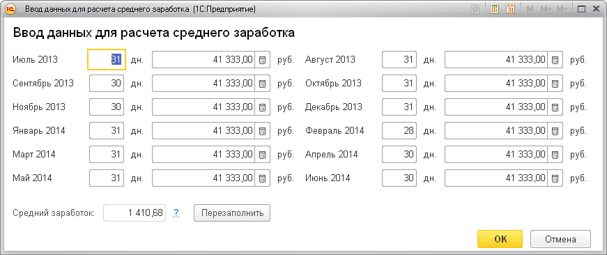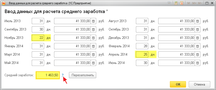Вот только рассчитанный средний заработок (1410.68) не совпадает с нашим (1463.50). А всё потому, что сотрудник в ноябре и апреле отработал неполные месяцы. Чтобы указать это программе нажмём на кнопку «Изменить» рядом со средним заработком. Вот они отработанные согласно производственном календарю дни и начисленный доход в предыдущие 12 месяцев: