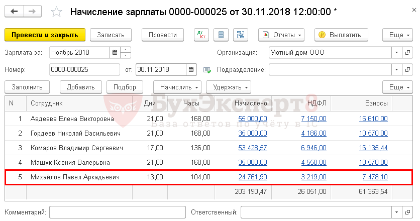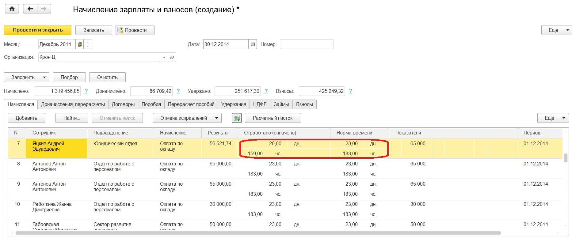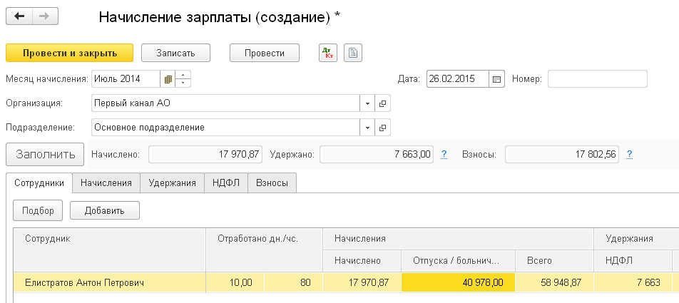 Наконец, проведём документ «Отпуск» по кнопке «Провести и закрыть» и увидим, что он начислил заработную плату сотруднику, но не начислил НДФЛ и страховые взносы.