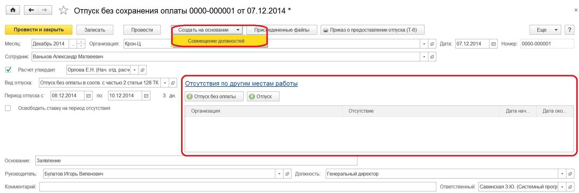 - При расчете зарплаты система будет учитывать наличие отпуска без сохранения оплаты и вычитать из оклада дни, которые сотрудник находился в этом отпуске.