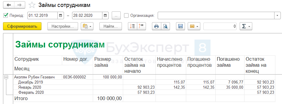 Дабы видеть все движение по уплаченным ежемесячным платежам подчиненным в рамках погашения тела займа и процентов по нему, разработчики предлагают пользователю сформировать отчет по сотруднику на погашение им займа.