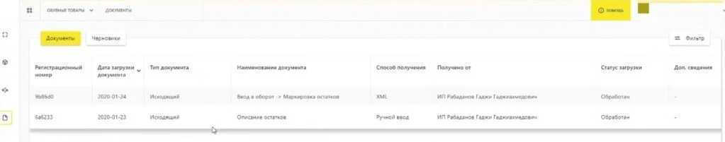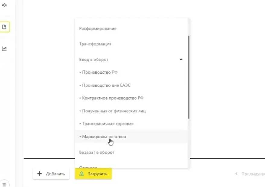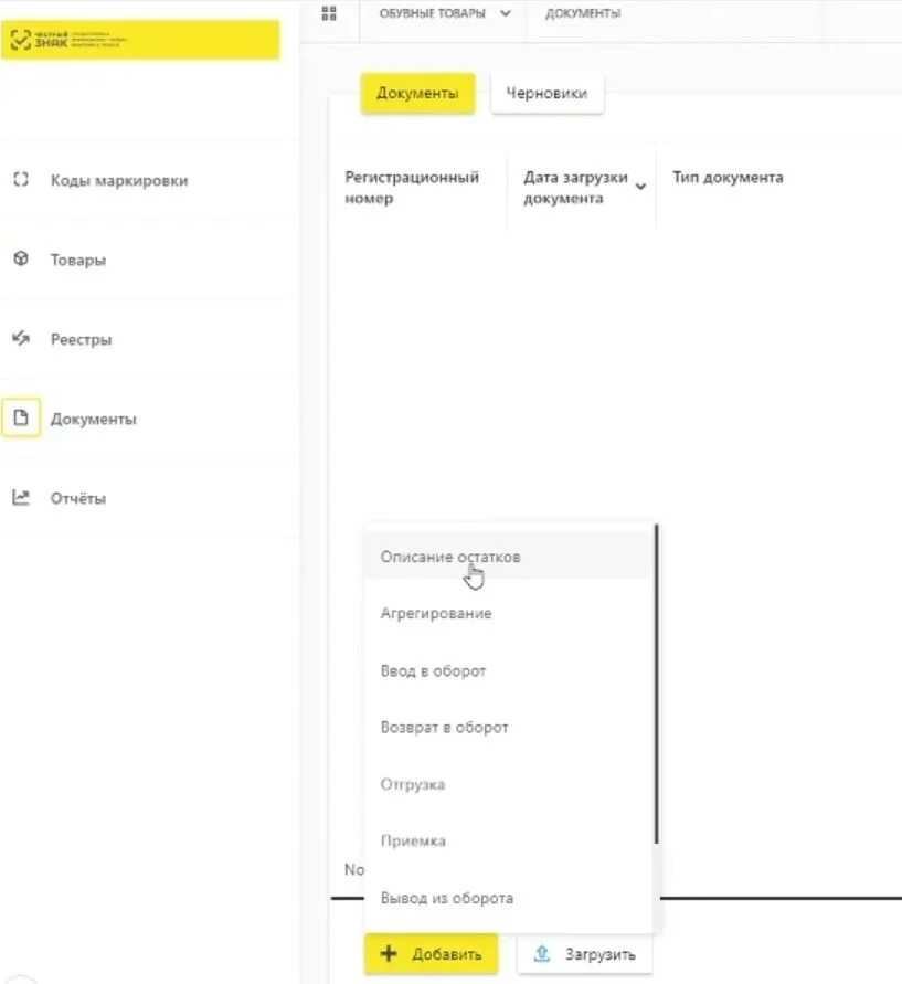ЭП. Выбираем раздел «Документы», нажимаем кнопку «Загрузить», «Маркировка остатков».