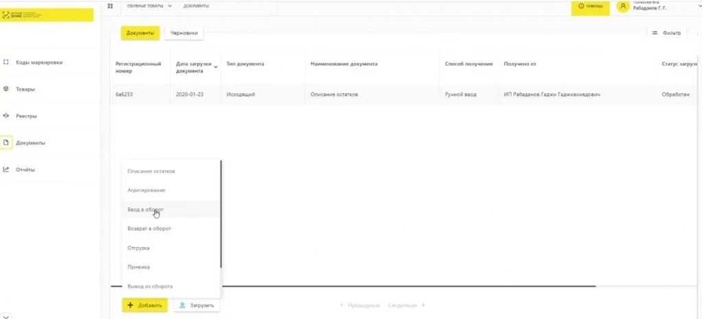 Также можно ввести товар сразу. Для этого необходимо зайти в «Документы», «Добавить», «Ввод в оборот», «Добавить маркировку остатков»