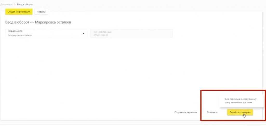 2. В самом документе выбираем вид документа «Маркировка остатков», переходим во вкладку «Товары», выбираем товары, которые ещё не были введены в оборот и подписывает документ ЭЦП.