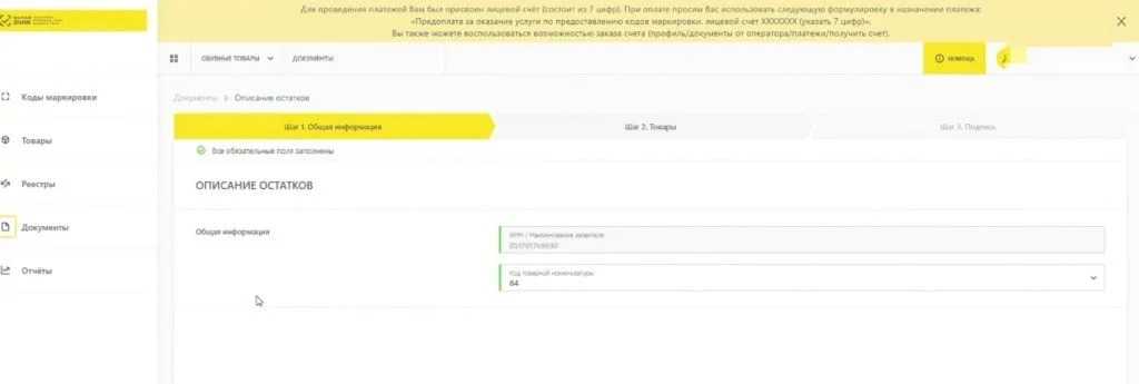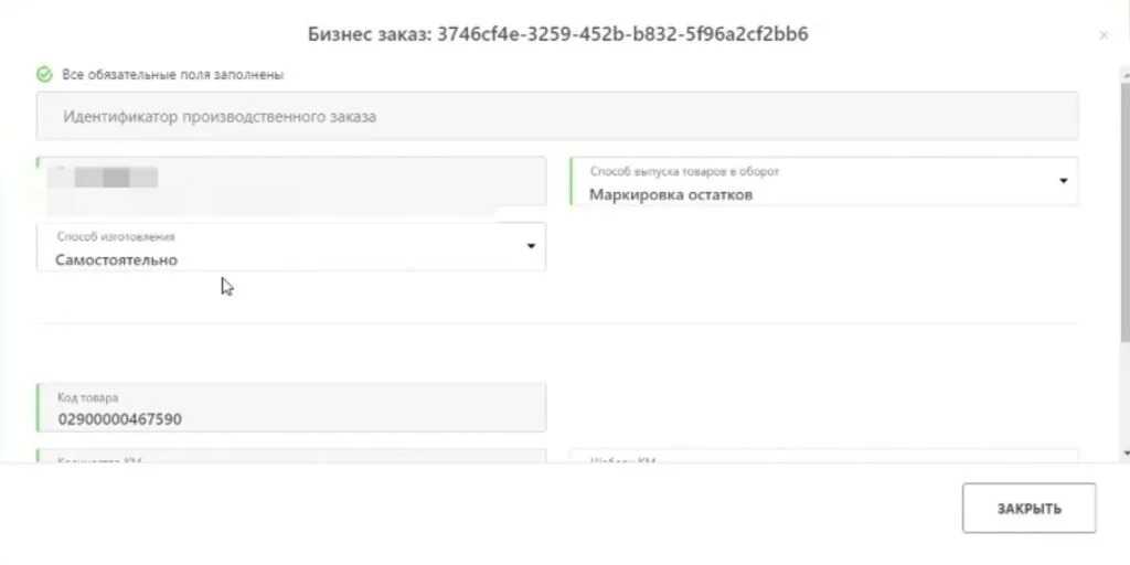 - Регистрация кода товара — содержит заполненные данные модального окна и все атрибуты, необходимые для возможности эмиссии кодов маркировки;