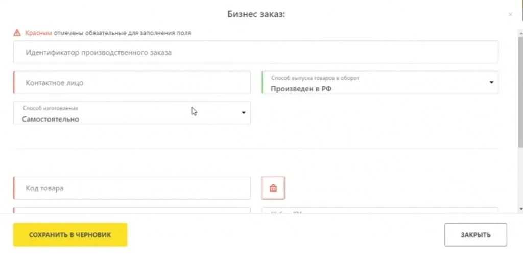 Полная форма карточки товара содержит набор атрибутов для выбранного кода ТН ВЭД ЕАЭС, а также отражает текущий статус карточки товара, тип карточки, признак доступности для заказа кодов маркировки и/или ввода в оборот.