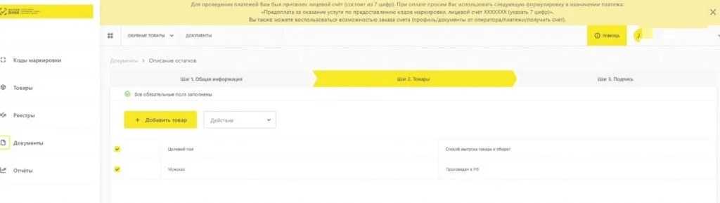 5. Заполняем поля документа товарами с характеристиками и загружаем в Честный Знак в тот же раздел импорта.