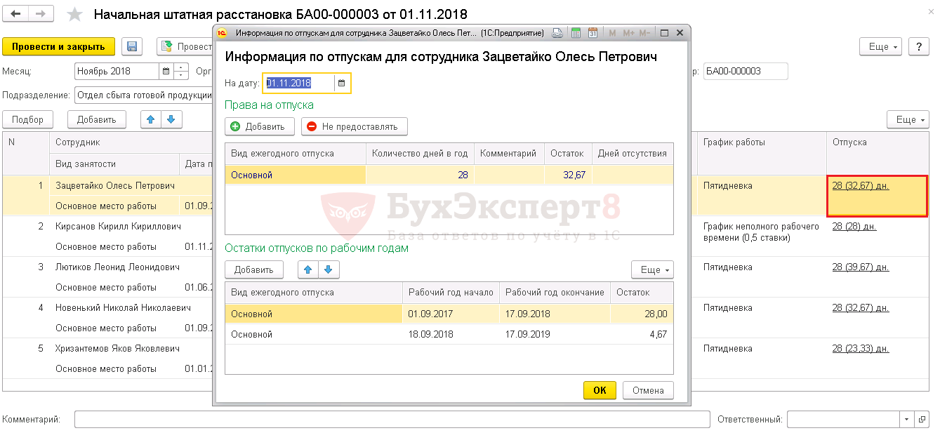 - Отпуска – в этой колонке заполняются сведения об остатках отпусков по сотрудникам в разрезе рабочих лет, а также сведения о праве сотрудника на отпуск(а):