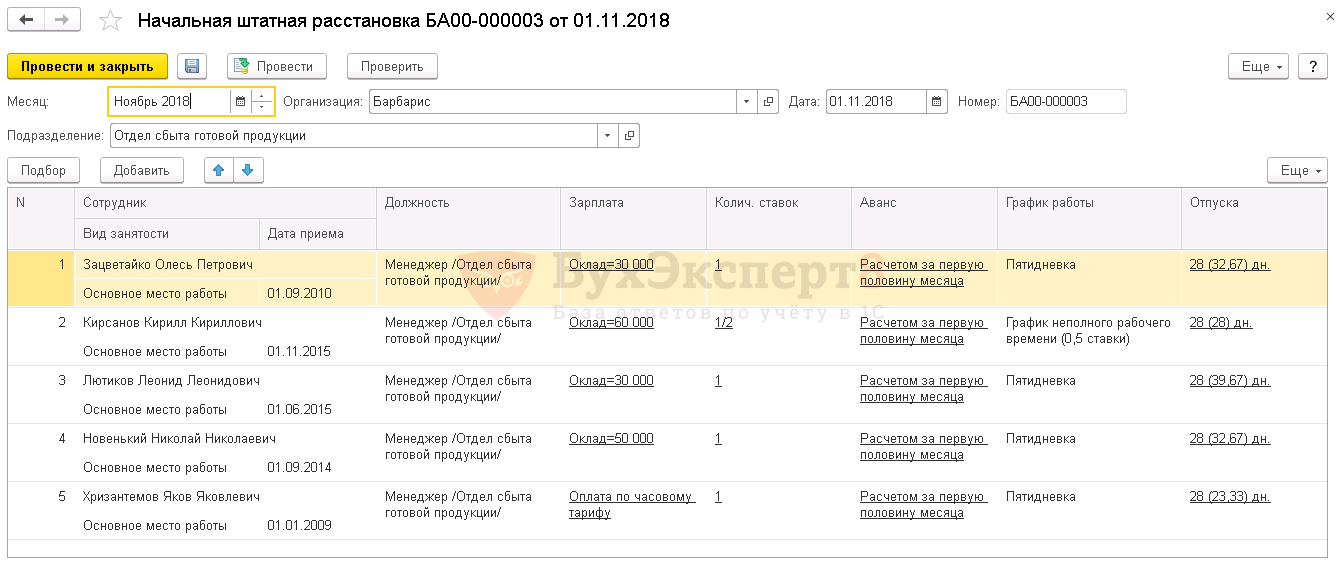 В документе указывается срез штатной расстановки работников на дату переноса данных.