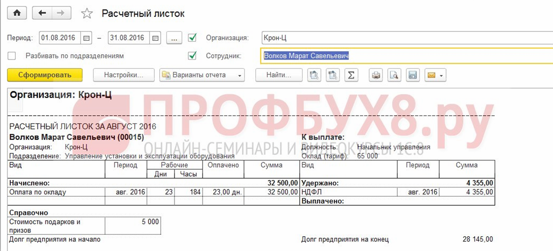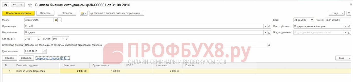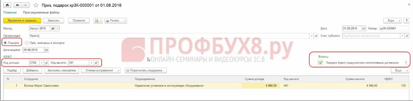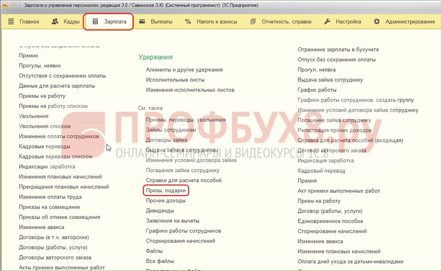 Курсы 1С 8.3 и 8.2 » Обучение 1С Бухгалтерия 3.0 (8.3) » Зарплата и кадровый учет » Подарок сотруднику в 1С 8.3 Бухгалтерия