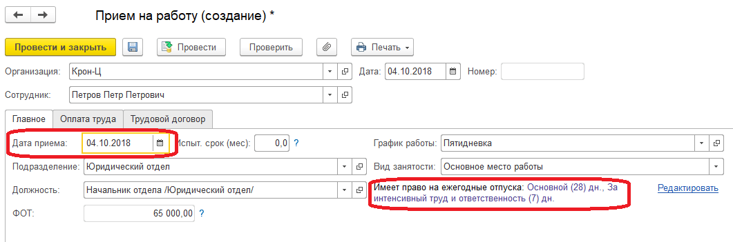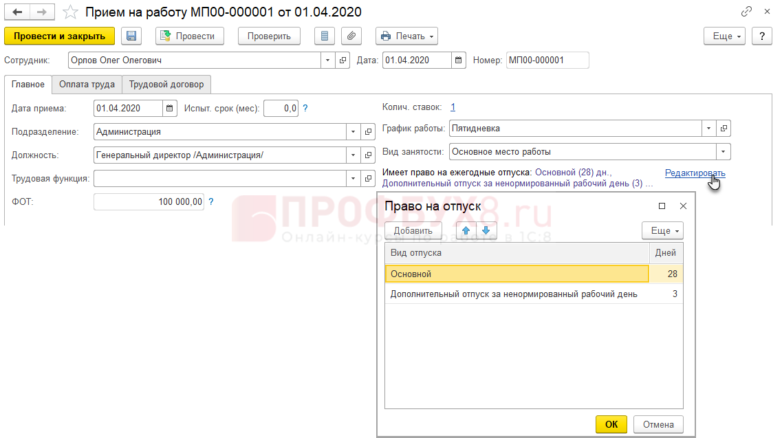 Зарегистрируем права на отпуск сотрудника при приеме на работу: