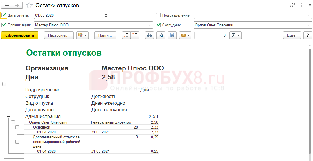Теперь посмотрим, накапливаются ли остатки отпусков, для чего сформируем отчет Остатки отпусков (Кадры – Кадровые отчеты) на 01.05.2020: