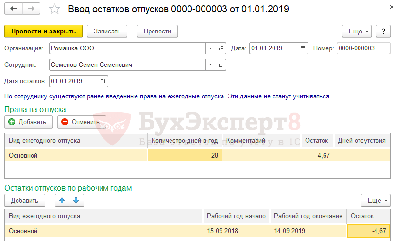 2. Если сотрудник использовал отпуск авансом, то количество дней остатка нужно указывать с минусом.