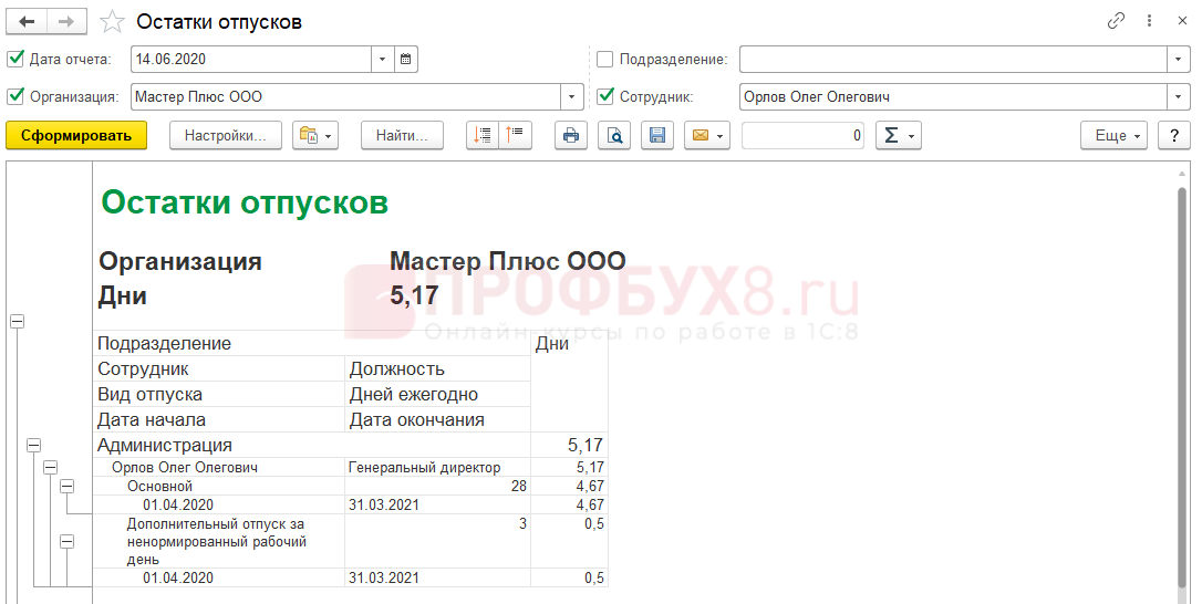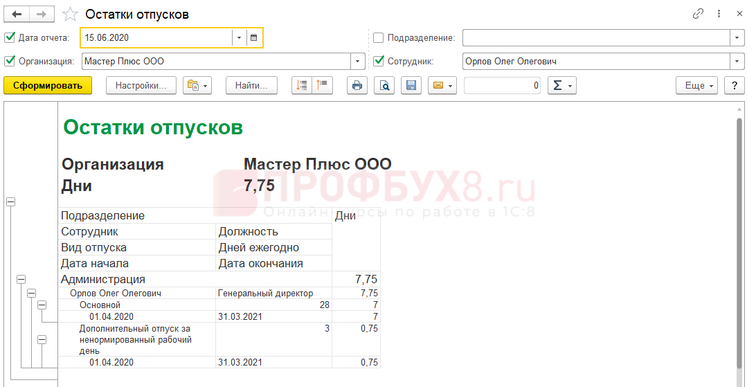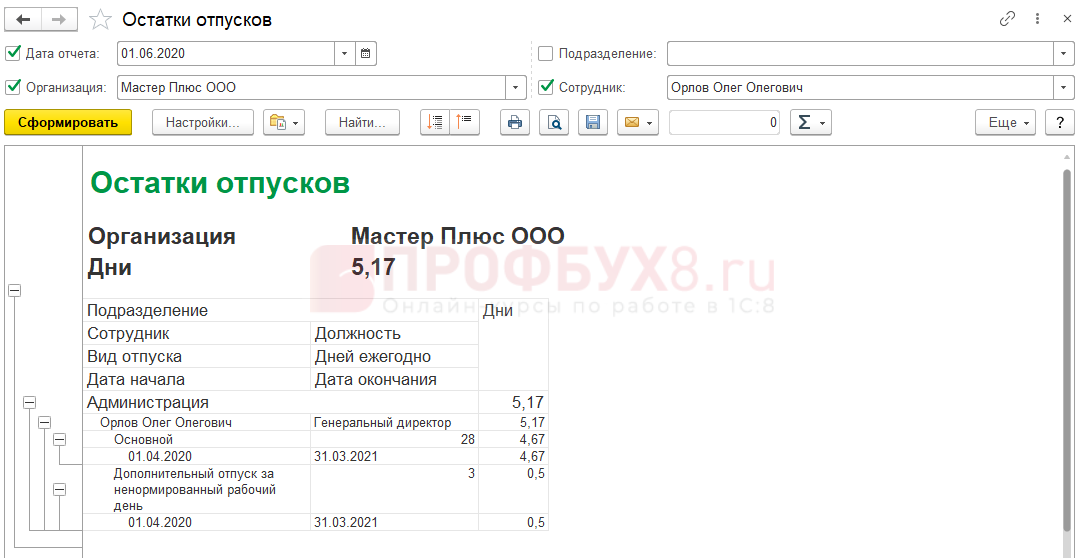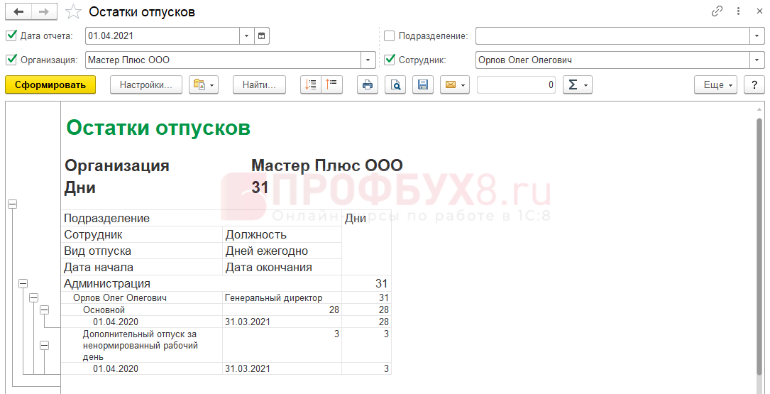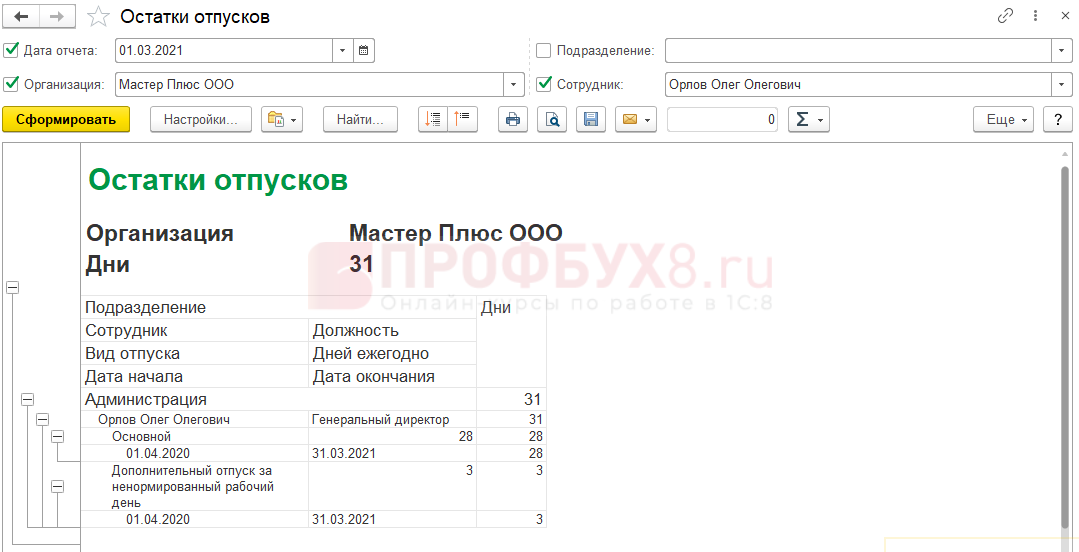 Шаг 3. Сформируйте отчет по остаткам отпусков в 1С 8.3 ЗУП 3.1
