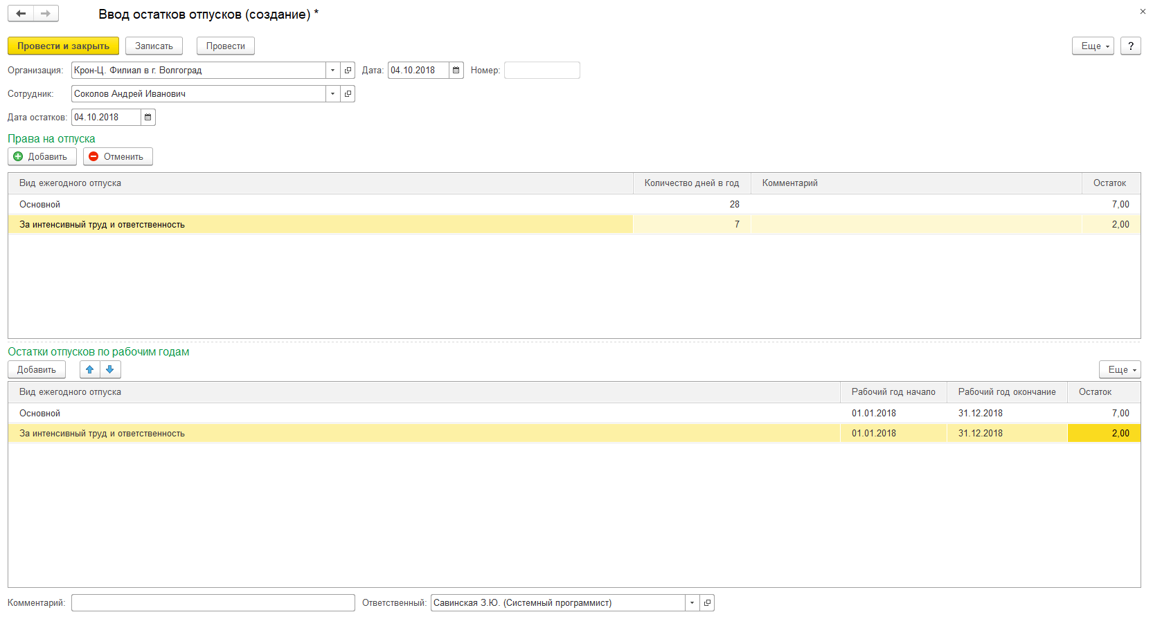 В табличной части вводятся остатки по каждому виду отпуска в разрезе рабочих лет. Количество дней должно быть рассчитано на дату начала эксплуатации.