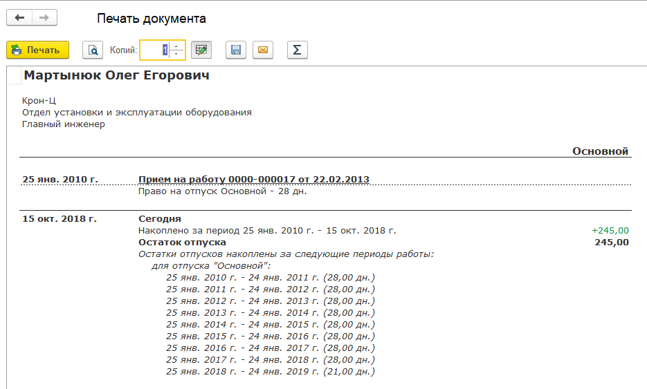 После чего будет сформирован печатный документ с информацией по остаткам дней отпуска.