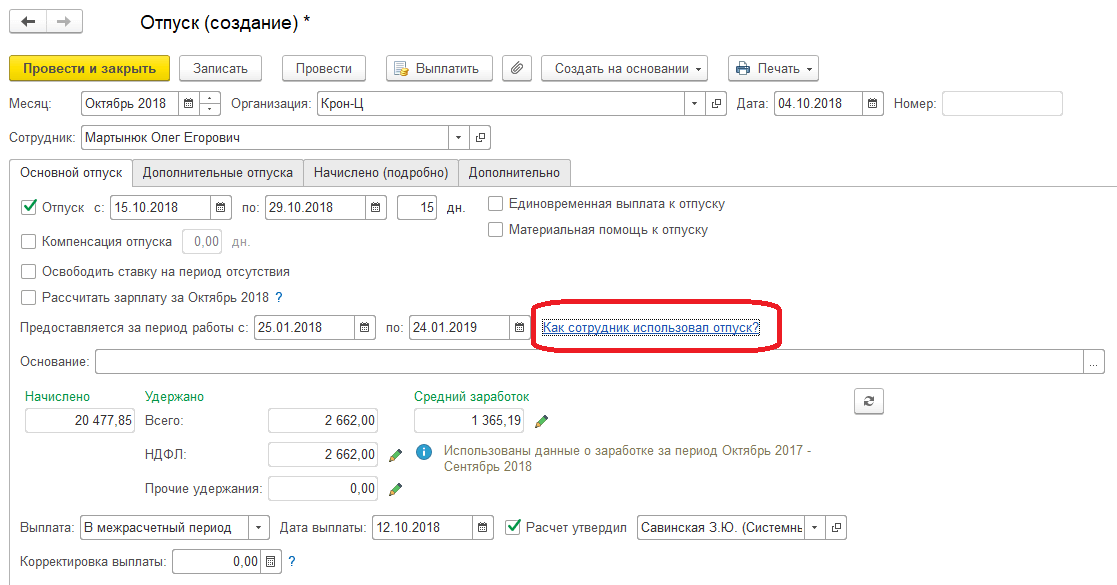 После того, как был выбран конкретный сотрудник, и заполнены все необходимые данные, нужно «провести» документ нажав соответствующую кнопку. Программа 1С в рамках этого процесса производит проводку бухучета по начислению отпускных. Это действие базируется на уже имеющихся в данной системе сведениях – срока трудового стажа сотрудника и назначенного ему оклада.