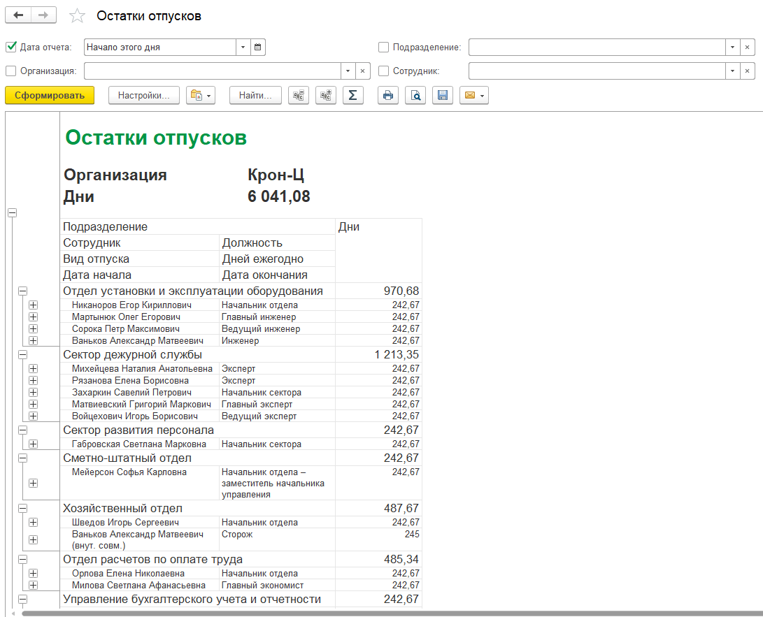 Сформируем отчет “Остаток отпусков” по всем организация и сотрудникам.