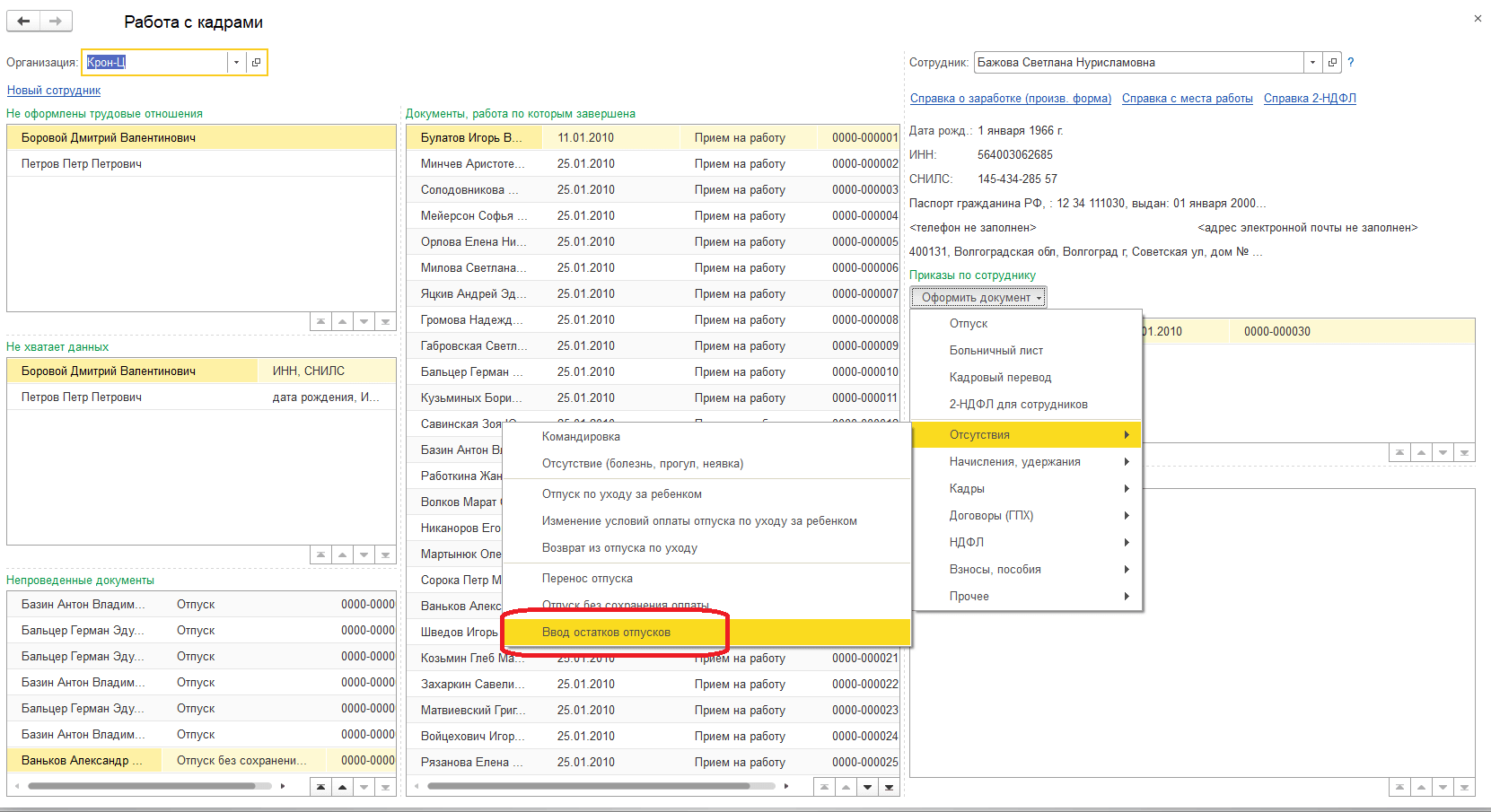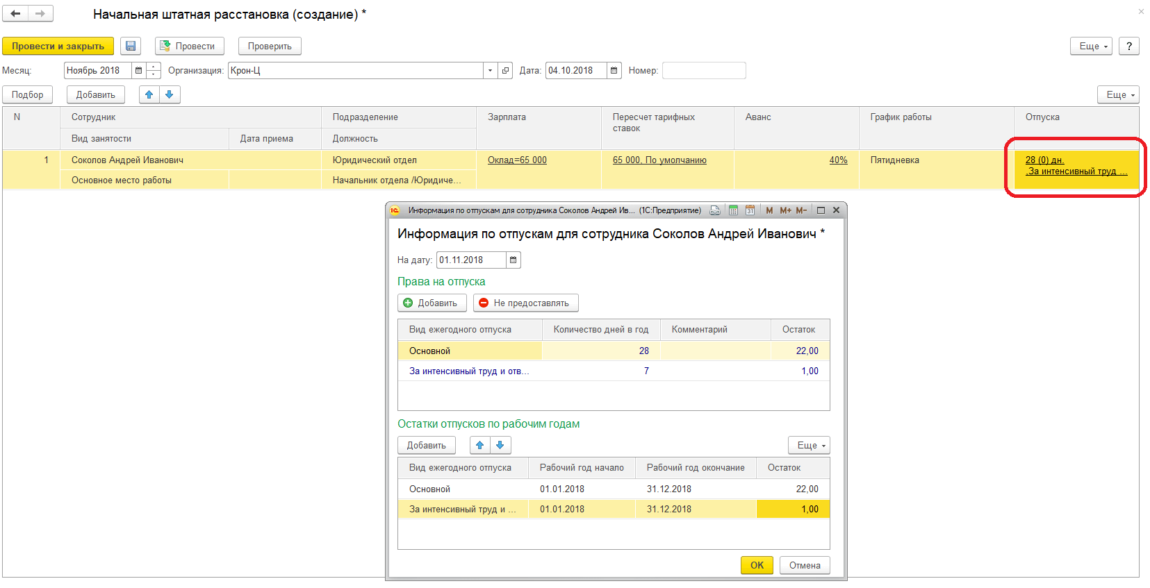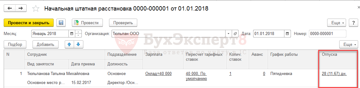 Ввод начальных остатков отпусков документом Начальная штатная расстановка