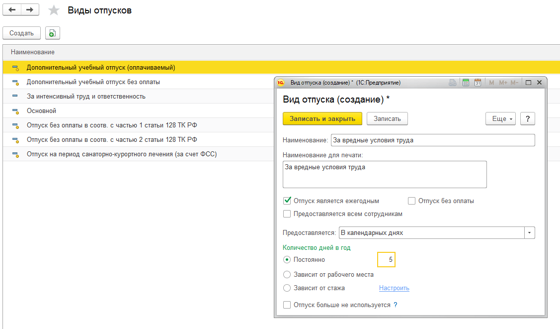 Откроется форма, в которой необходимо указать наименование вида отпуска, в нашем примере он будет являться ежегодным и предоставляться постоянно 5 дней в год. В программе расчет дней отпуска ведется автоматически, после того как сотрудник принят на работу. Для этого оформляется документ “Прием на работу”.