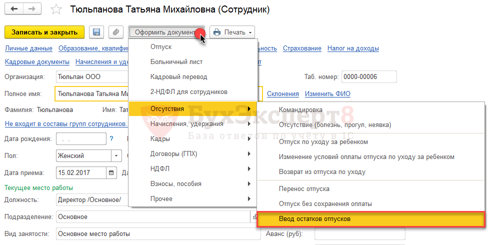 Чтобы проверить, были ли внесены остатки отпусков верно, загрузите еще раз форму с данными сотрудника и проверьте, что поле «Остаток отпуска» содержит нужное значение.