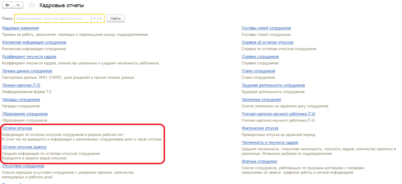 - «Остатки отпусков (кратко)» (4). Сокращенный вариант отчета.