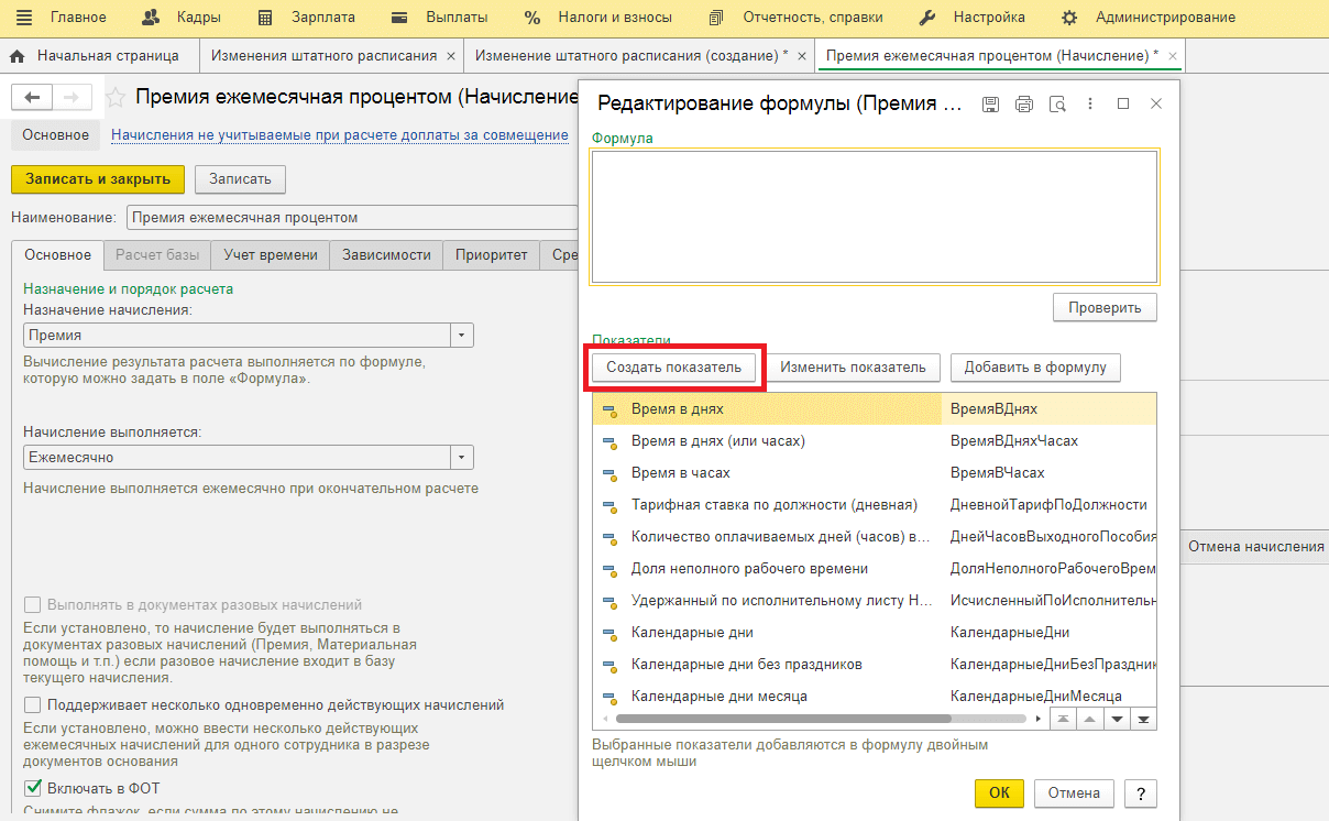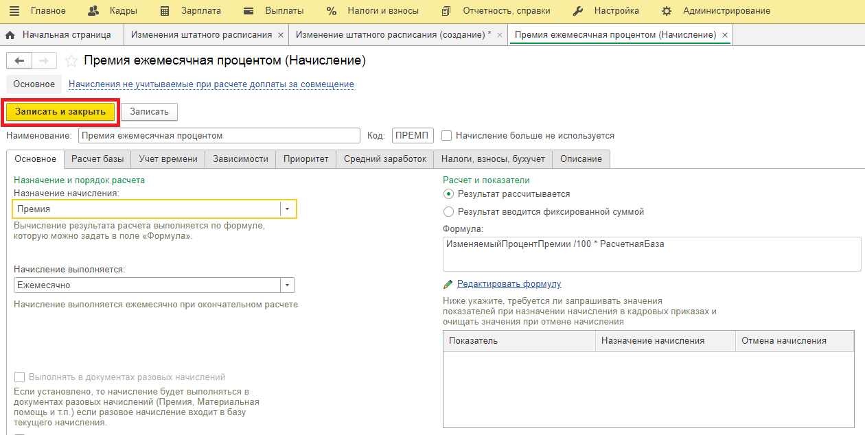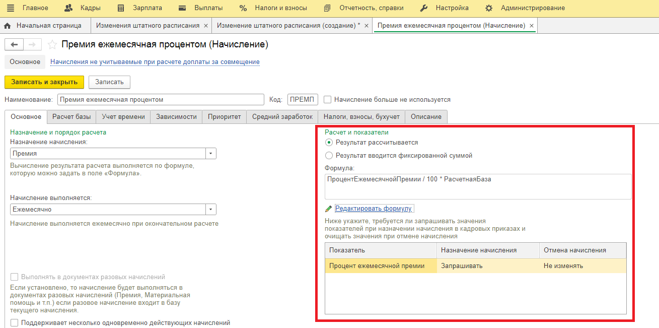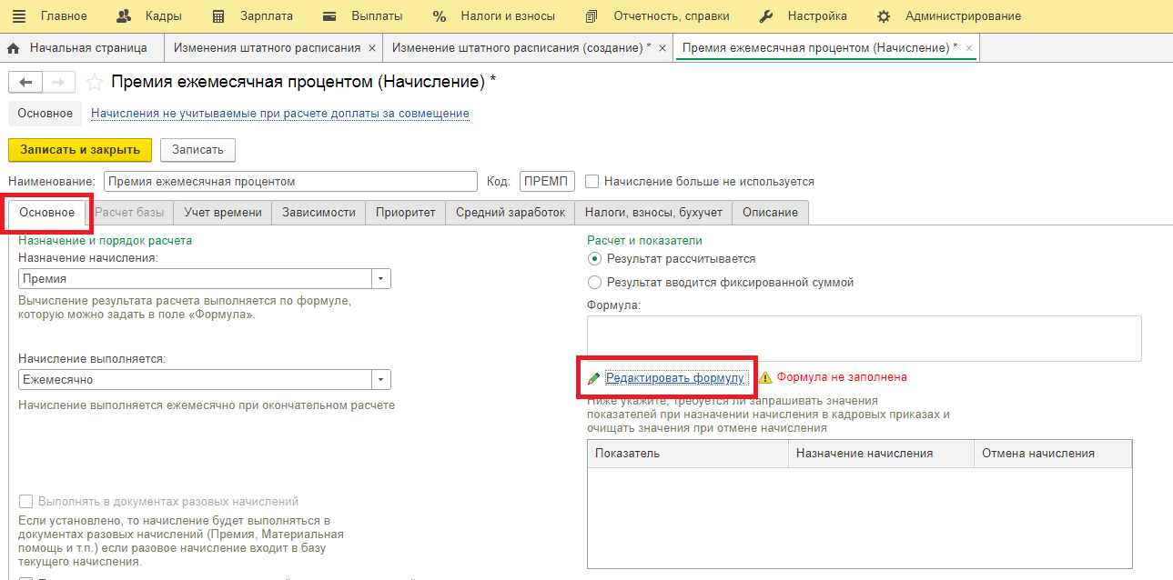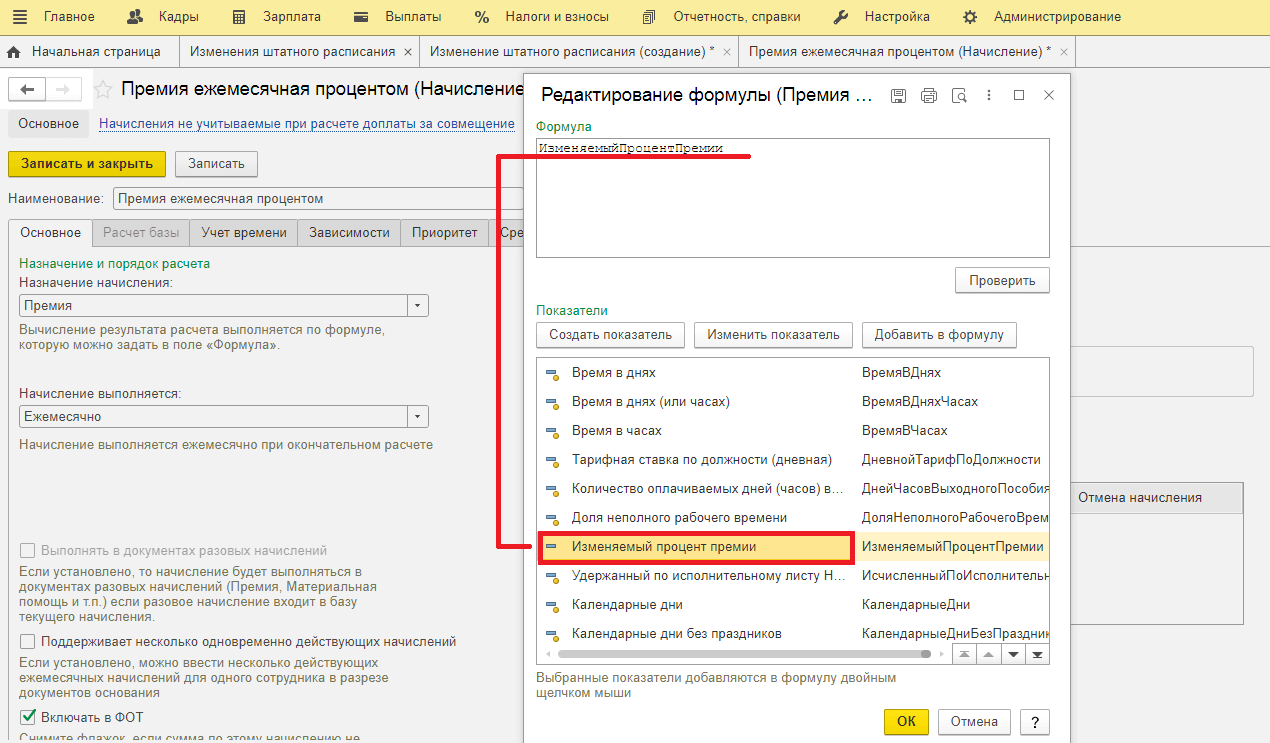 Вернемся обратно к формуле расчета. Допустим, премия, равная некоторому проценту от расчетной базы, будет изменяться. Настроим такую формулу, нажав на подсвеченную синим фразу Редактировать формулу.