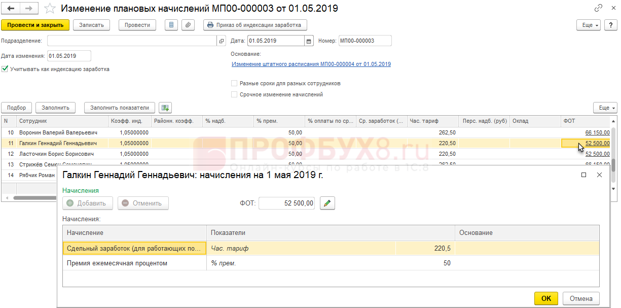 В документе Изменение плановых начислений в строчке по сотруднику Галкин Г.Г. щелкнем в колонке ФОТ: