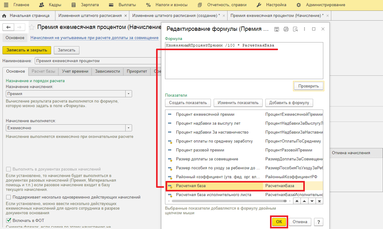 Дописываем формулу. Расчетную базу берем из того же перечня (настройка расчетной базы происходит в соседней вкладке, как мы писали выше). Нажимаем ОК для сохранения формулы.