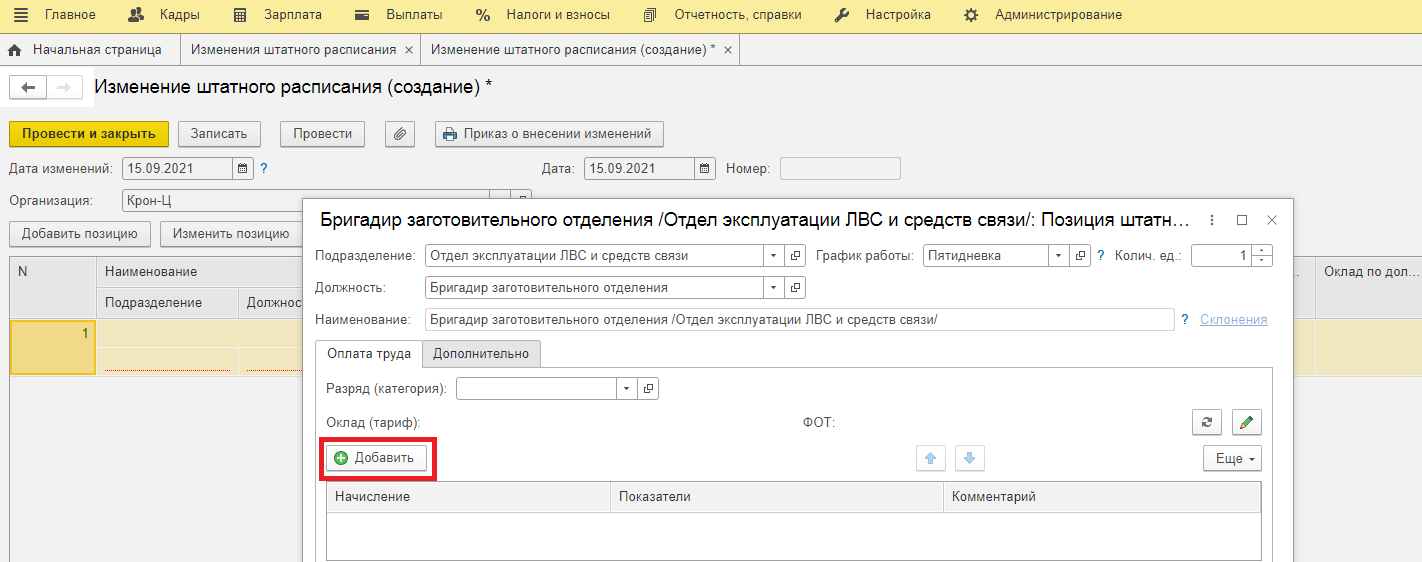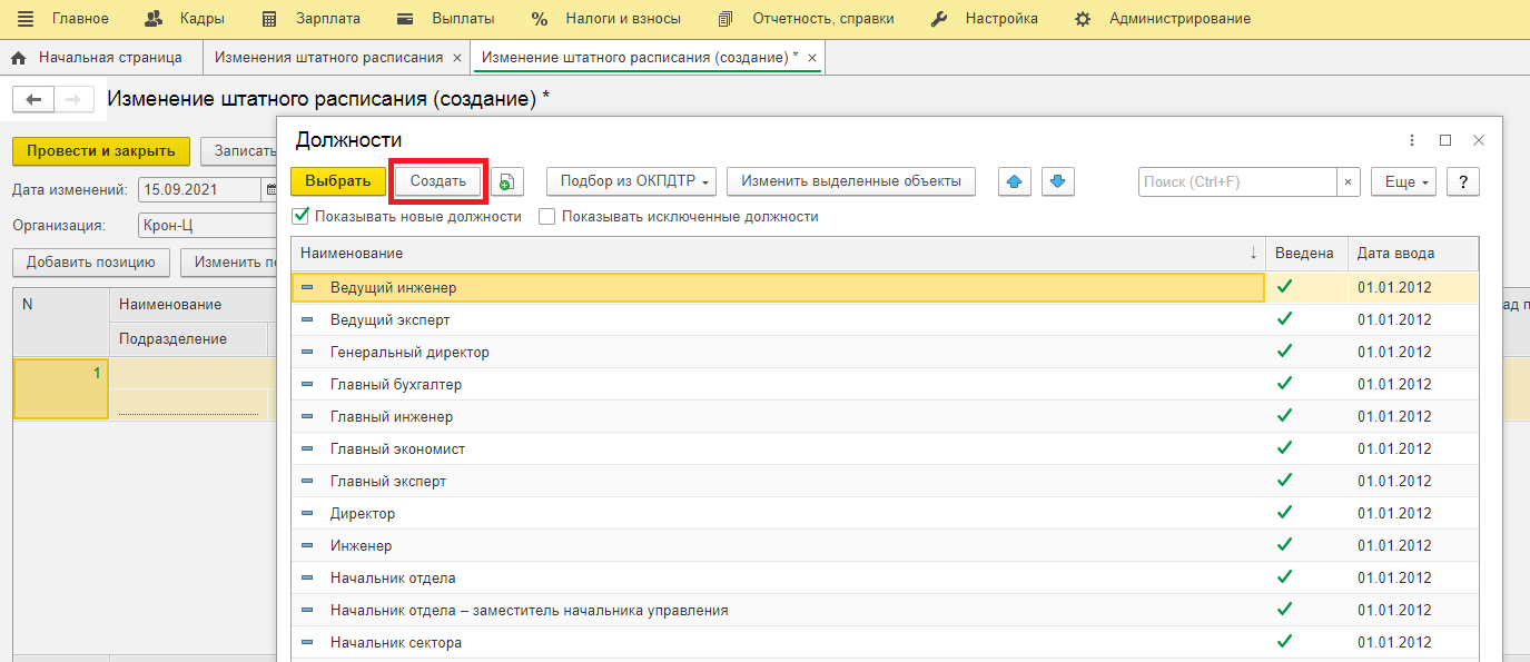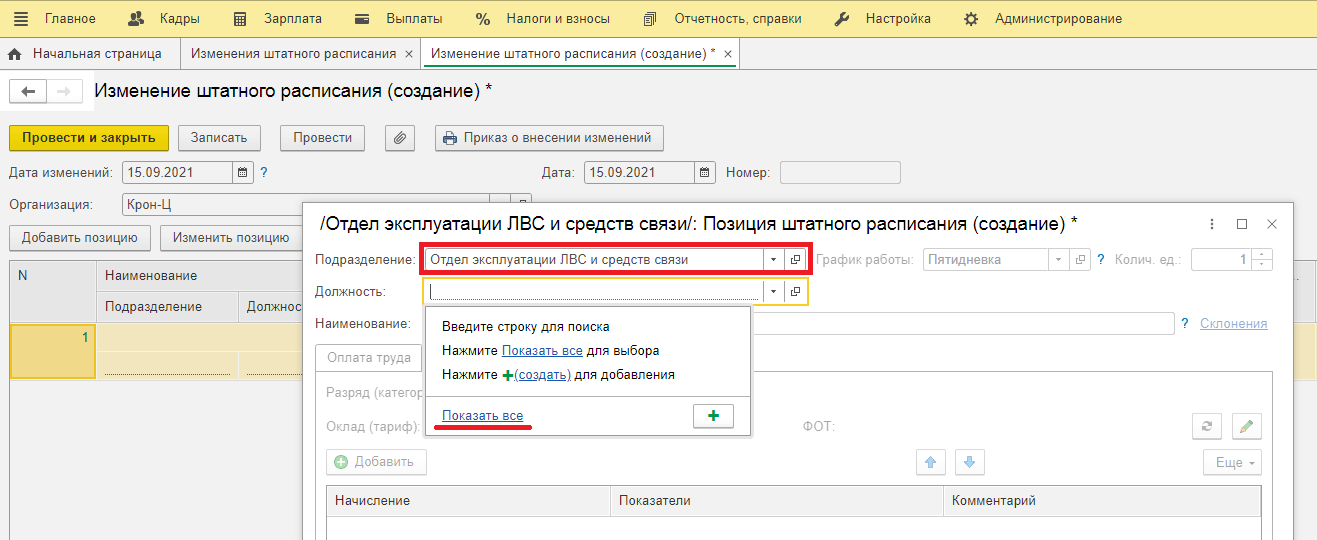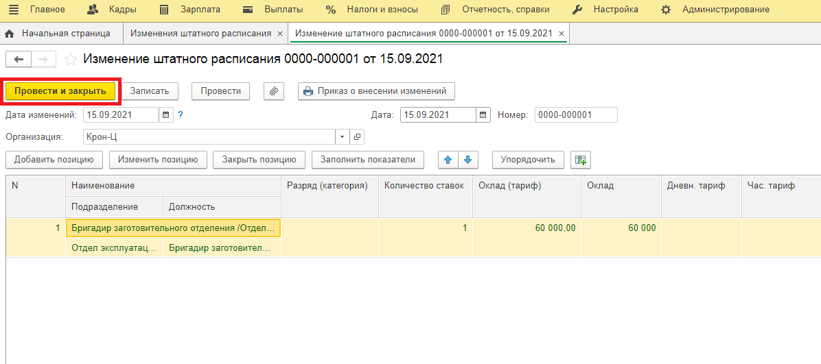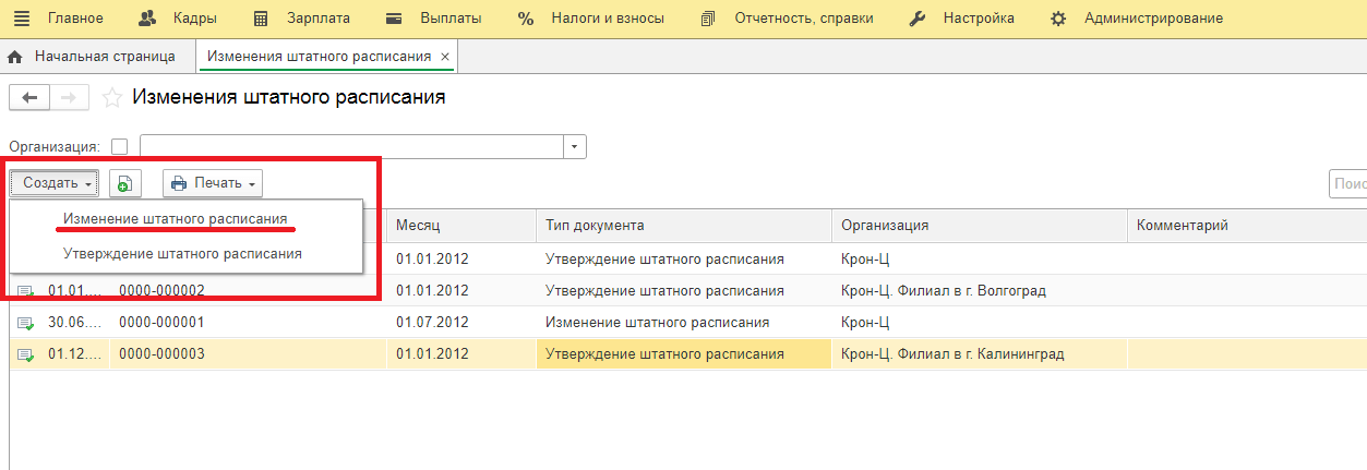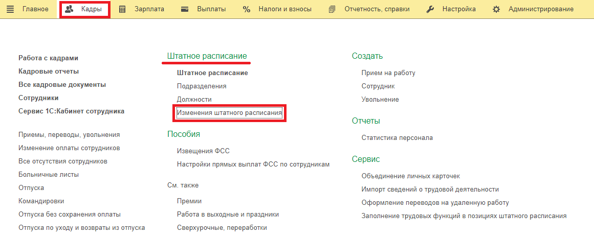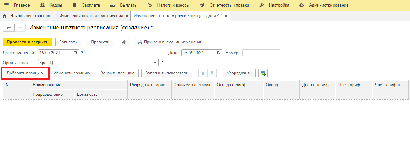 При любом изменении штатного расписания проходим путь с главной страницы: Кадры – Штатное расписание – Изменение штатного расписания