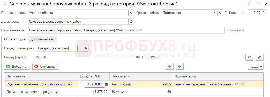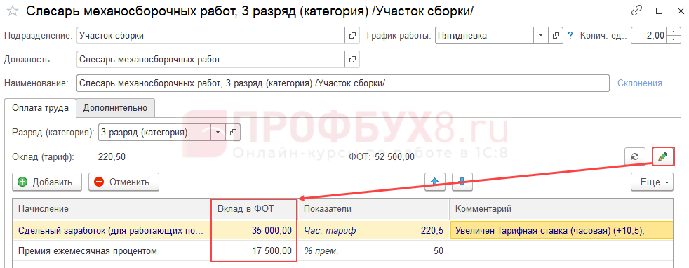 Для позиции Слесарь механосборочных работ, 3 разряд (категория) /Участок сборки/ назначено начисление Сдельный заработок (для работающих по часовому тарифу). Вклад начисления в ФОТ = 35 000,00 руб. После увеличения часовой тарифной ставки ФОТ начисления не изменился. Необходимо скорректировать его вручную.