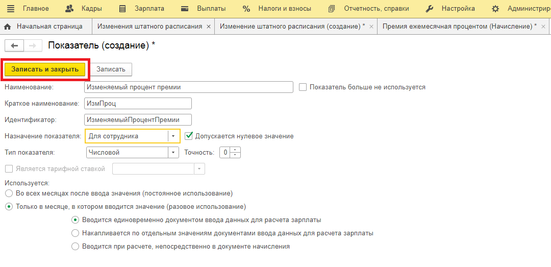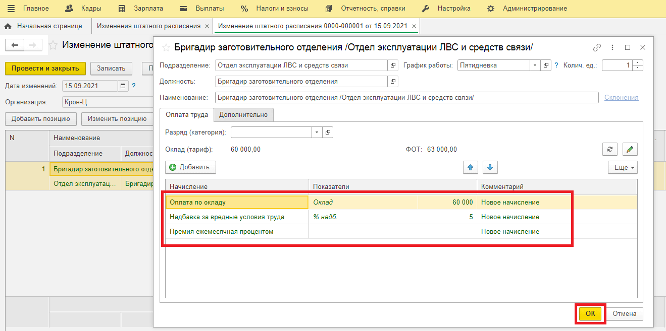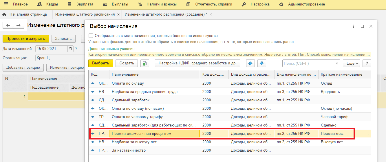 Двумя кликами добавляем ежемесячную премию в список выплат по должности.