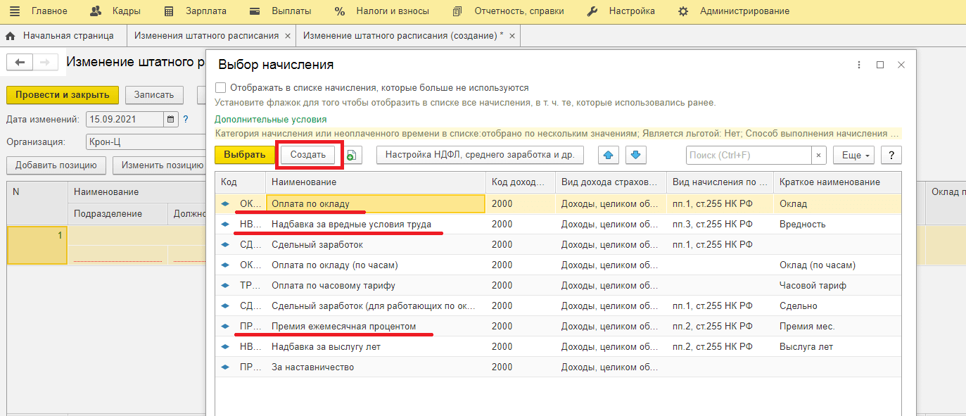 В открывшемся списке мы видим выплаты, которые можно добавить. Кнопкой Создать можно сформировать новые виды выплат. Нас интересуют оклад, надбавка за вредность и изменяющаяся премия.