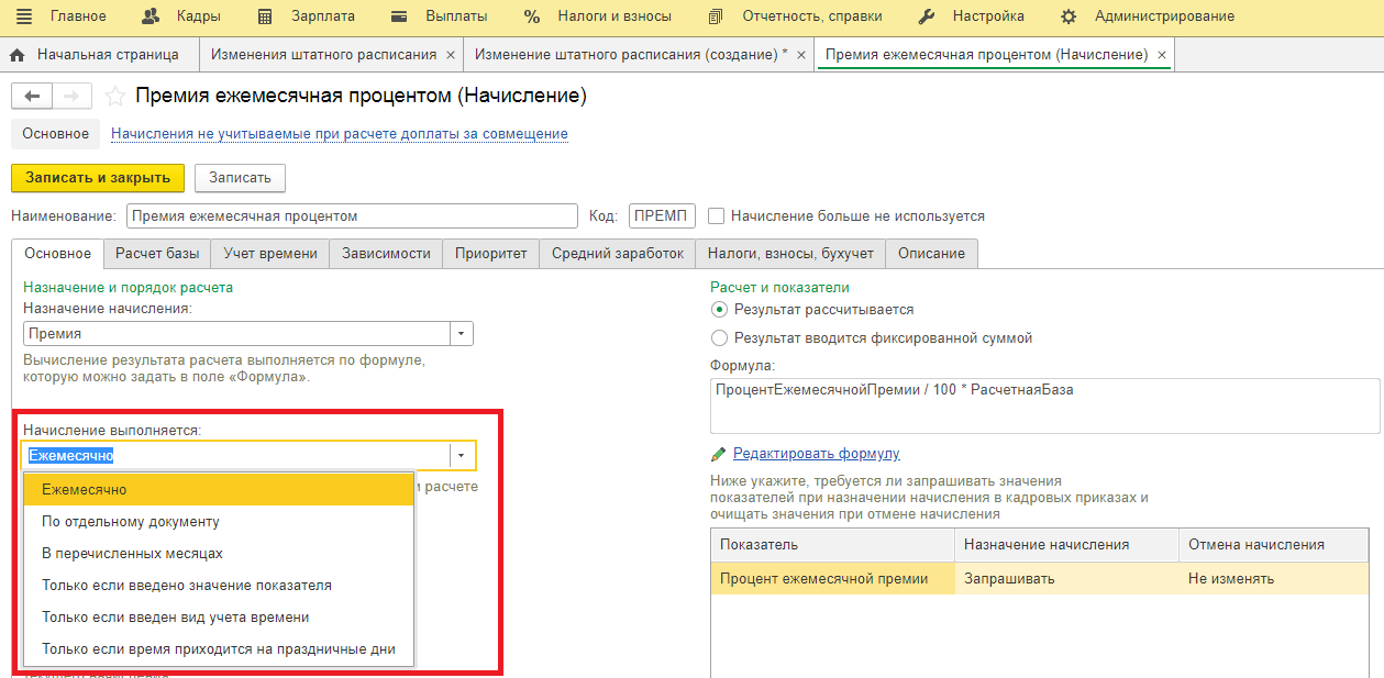 В открывшемся окне есть много вкладок и параметров для установки нюансов премии. Можно установить периодичность начисления.