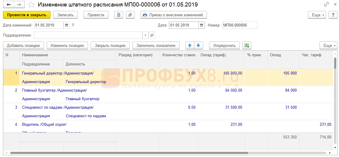 Внесена в штатное расписание новая должность. При начислении зарплаты сотруднику с данной должностью будет сразу производиться начисление надбавки за вредность. Нажимаем Провести и закрыть. В штатном расписании появилась новая должность.