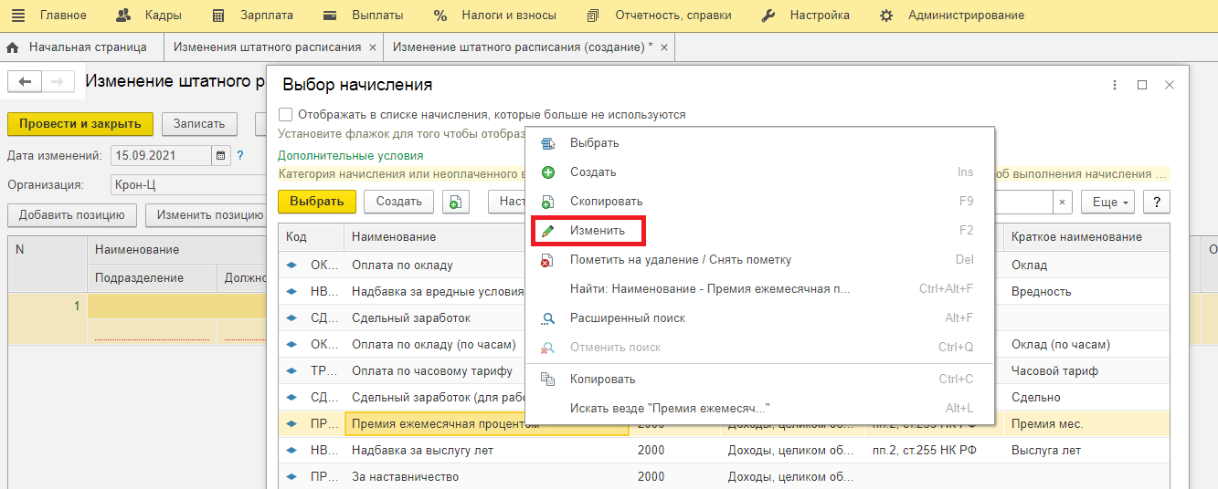 Например, в списке есть ежемесячная премия процентом. Настроим ее под свои нужды. Для этого нажимаем на правую кнопку мыши и выбираем Изменить.