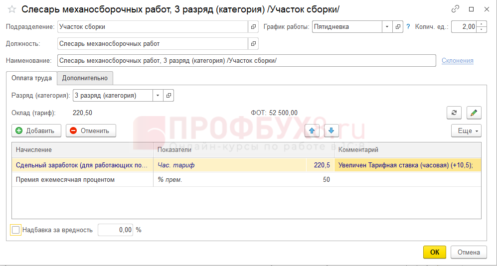 Вносим значения оклада (в рублях) и надбавки за вредность (в процентах). Нажимаем ОК для сохранения.