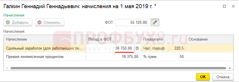 Обратите внимание, что для некоторых начислений, например, для Сдельного заработка, ФОТ не рассчитывается автоматически, поэтому его нужно скорректировать вручную. Рассмотрим ситуацию на примере