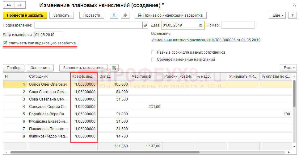 Документ создается уже полостью заполненным. В нем рассчитаны Коэффициенты индексации для каждого сотрудника и установлен флажок Учитывать как индексацию заработка: