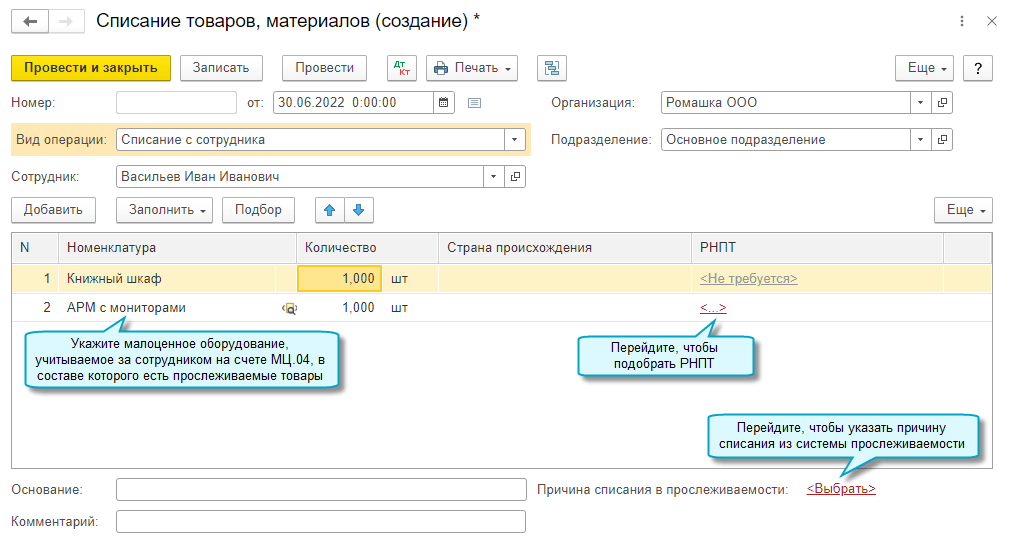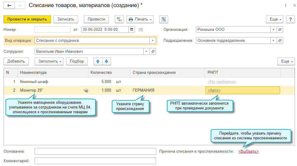 Добавлена возможность списания РНПТ в документ Списание товаров, материалов. Для тех случаев, когда списываются прослеживаемые материалы или комплекты, числящиеся за конкретными сотрудниками.