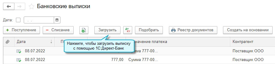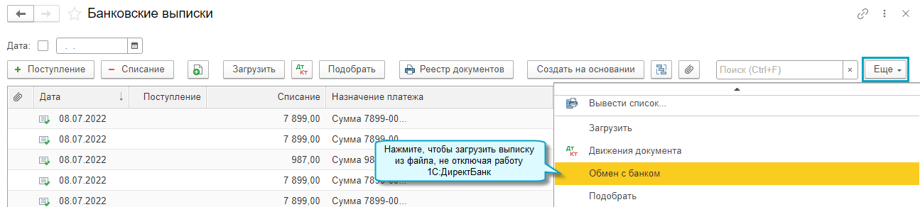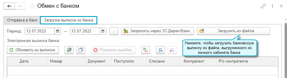 Предложение загрузить выписку из файла также доступно, если прервать процесс получения выписки с помощью 1С:ДиректБанка.